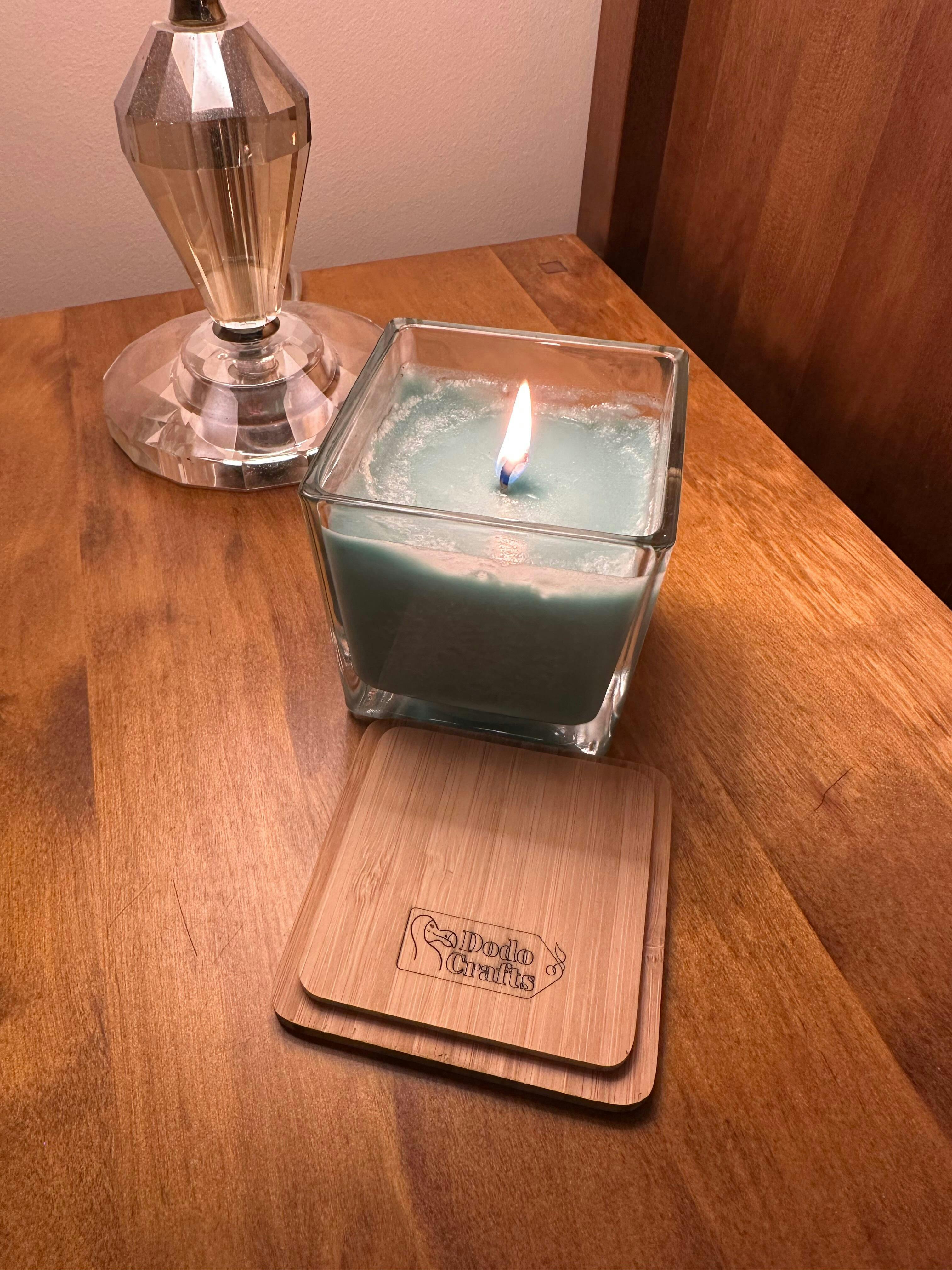 Each candle is carefully hand poured by Dodo and presented in a clear square glass jar with a natural bamboo lid handmade by Dodo. Measuring approximately 10cm cubed, you can expect approximately 50+ hours burn time from this 220g candle.